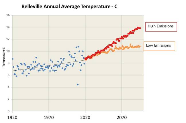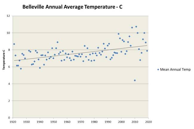 People that have lived in the region for a long period of time are likely able to answer this question. However, as a lot of changes occur gradually many people learn to adapt and adjust. To help identify these changes we turn to climate monitoring stations that provide data over long periods of time. A monitoring station in the City of Belleville shows that the average annual temperature has warmed by 1.8 degrees Celsius over the past 100 years. Precipitation events also appear to be larger and more intense including more winter rain storms and extreme weather events.